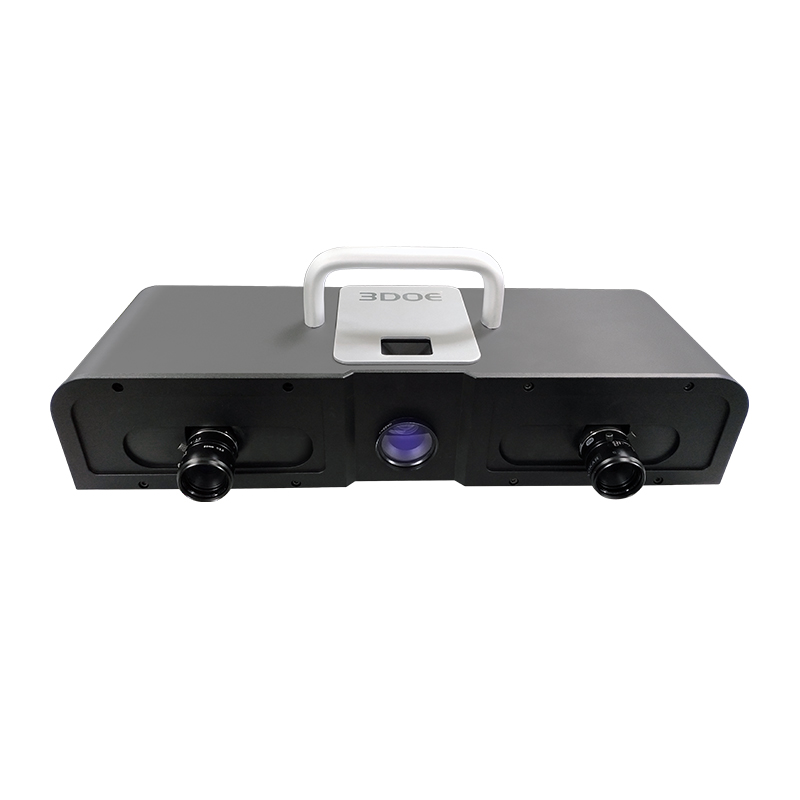 The 3DOE 3D measuring head is composed of two high-resolution industrial CCD cameras on the left and right and a grating projection unit. The structured light measurement method is used to project a group of grating fringes with phase information onto the surface of the measured object using the grating projection unit. The two cameras on the left and right can measure simultaneously, and combine computer vision technology, photoelectric sensor technology, image processing technology and software control technology to obtain high-density three-dimensional data on the surface of the object in a very short time. The rotating object or scanning head is used to change the scanning angle of view. Based on the automatic splicing technology of multi-view point cloud, it can complete 360° scanning of the object in all directions.